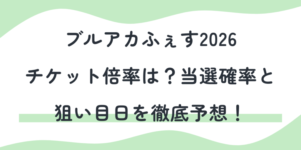 ブルアカふぇす2026チケット倍率は?当選確率と狙い目日を徹底予想!2026年1月17日・18日に幕張メッセで開催される「ブルアカふぇす2026」。 チケット先行受付を前に、SNSではすでに「倍率ヤバそう」「当たらない気しかしない」と話題になっています。 この記事では、過去データをもとにした当選確率予想、狙い目公演、グッ...