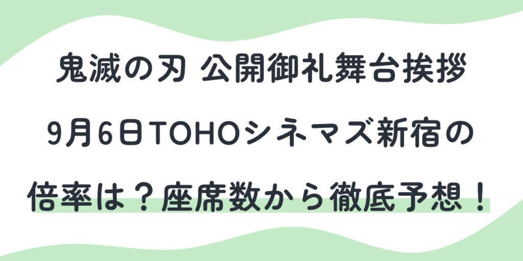 鬼滅の刃 公開御礼舞台挨拶9月6日TOHOシネマズ新宿の倍率は?座席数から徹底予想!大ヒット中の劇場版「鬼滅の刃 無限城編 第一章 猗窩座再来」の公開御礼舞台挨拶が、東京・TOHOシネマズ新宿で開催されます。 豪華声優陣が登壇する貴重な機会とあって、ファンの間では「チケットが取れるのか?」と話題沸騰中です。こ の記事では、使用さ...
