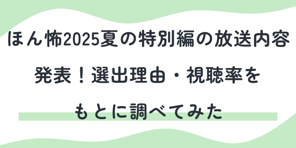 ほん怖2025夏の特別編の放送内容発表!選出理由・視聴率をもとに調べてみた2025年8月16日(土)21時から放送されるフジテレビ系『ほんとにあった怖い話 夏の特別編2025』では、 全国のファン投票による「最恐選挙2025」の結果が発表され、過去の名作6作品が“初”デジタルリマスター化されて放送されます。 MCの稲垣吾郎さんも推す石...