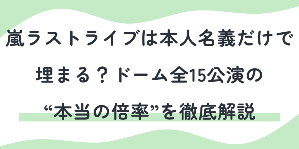 嵐のラストライブが発表され、ファンの間では喜びと同時に“当選できるのか問題”が一気に広がっています。特に多いのが、 「本人名義だけだとドーム全部埋まらないのでは?」 という声。しかし、実際の数字とファンクラブ(FC)の規模を並べてみると、この... -